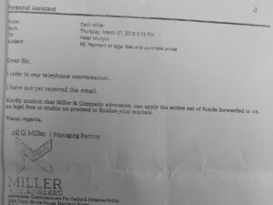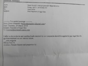 A day later, on April 1, forwarded to Miller an email wrote on March 24, 2016 saying: “I refer to above and confirm funds remitted by our companies should be applied to pay legal fees for services rendered on our various issues.”