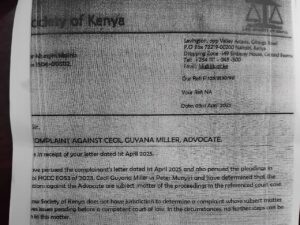 LSK had determined that it could not handle the complaint as the issues raised are the same ones in a court case in which Miller has sued Munyiri.