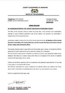 Bungoma County Governor Kenneth Lusaka dissolves his cabinet, this follows the ongoing fights with the County Assembly MCAs who had earlier planned to impeach his ministers (CECMs).